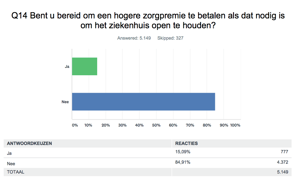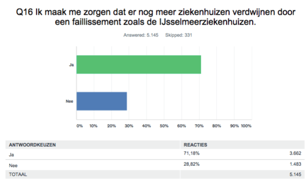 Veel Nederlanders (71%) verwachten dat er meer ziekenhuizen failliet zullen gaan. Drie kwart is bang dat de wachtlijsten in ziekenhuizen gaan oplopen na het faillissement van MC Slotervaart en MC IJsselmeerziekenhuizen. Iets meer dan de helft vindt dan ook dat een ziekenhuis niet failliet zou mogen gaan. Een overgrote meerderheid (85%) is echter niet bereid om hier dan zelf ook meer premie voor te betalen. Als faillissement dreigt, moet de minister van Volksgezondheid (70%) of de landelijke politiek beslissen over het voortbestaan van het ziekenhuis en niet de zorgverzekeraars (14%) of banken. Dat blijkt uit een peiling van vergelijkingssite Zorgkiezer onder 5.300 mensen in samenwerking met BNNVARA consumentenprogramma Kassa.