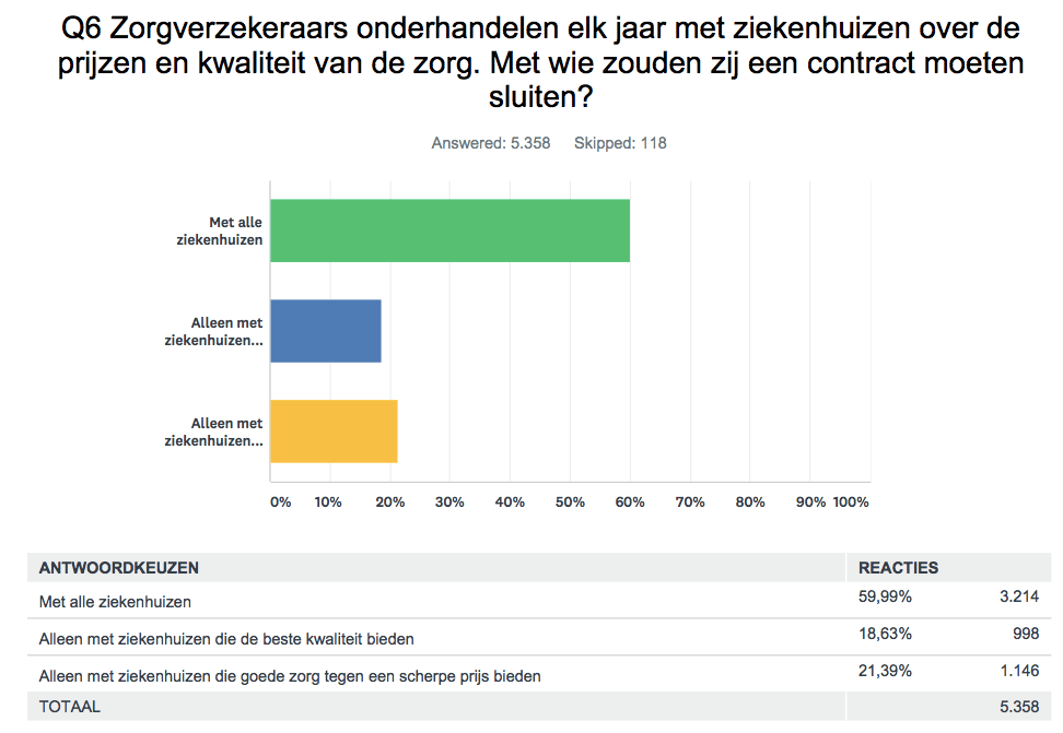 Op dit moment worden alle ziekenhuizen in Nederland in principe gecontracteerd. En alhoewel een meerderheid van zes op de tien vindt dat alle ziekenhuizen door de zorgverzekeraars gecontracteerd zouden moeten worden, vindt toch ook al 40% van de mensen dat er door de zorgverzekeraars alleen contracten gesloten moeten worden met ziekenhuizen die de beste kwaliteit leveren (19%) of goede zorg tegen een scherpe prijs (21%) leveren.